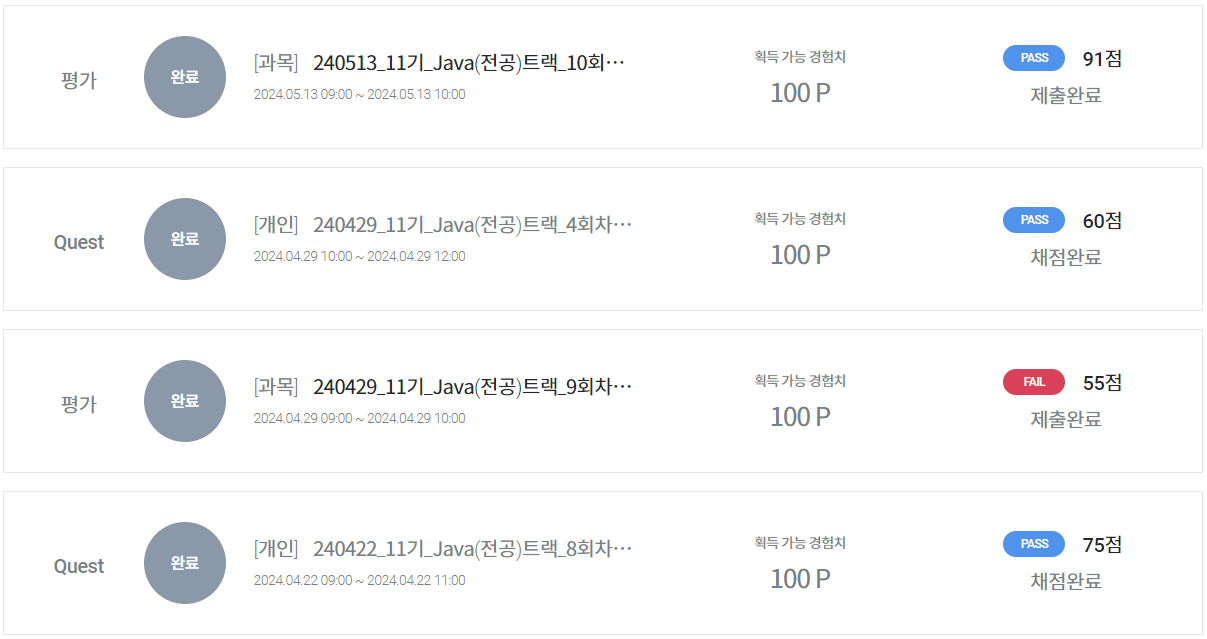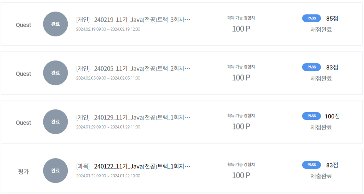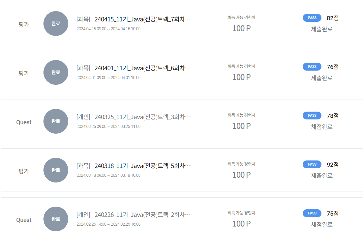 9번의 과목평가와 5번의 월말평가를 치뤘다..!(과목평가 한 번은 졸업식 이슈로 공가) 알고리즘 때는 100점도 맞았었고 프론트엔드도 90점대를 유지했지만, 백엔드에서 과락을 경험하고 나의 길이 아님을 다시 한 번 깨닫게 되었다..