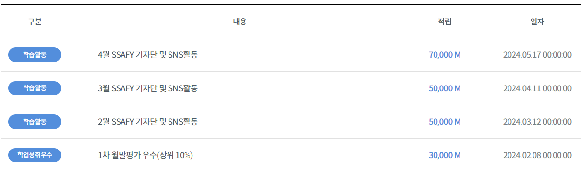 SSAFYcial을 하면 한 달에 5만 마일리지씩 준다. 4월부터는 홍보단 활동으로 2만 마일리지를 추가로 받았다. 마일리지는 학기가 끝날 때 현금화 할 수 있다. 월말평가 우수 마일리지까지, 1학기를 마치고 총 20만원을 정산할 수 있게 되었다!!