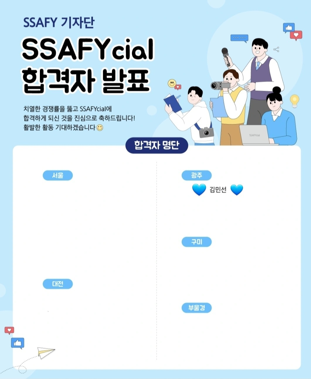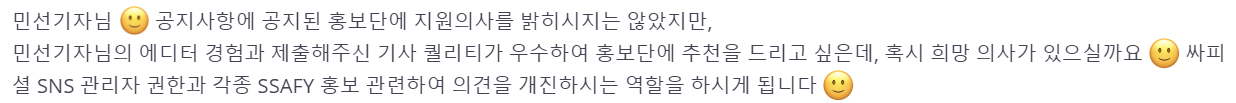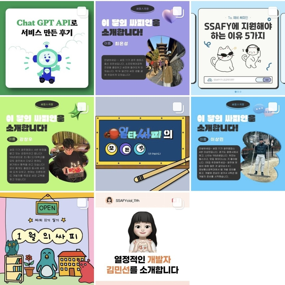 기자단 활동을 하던 중 SSAFYcial 공식 인스타그램 계정이 만들어졌다. 홍보단으로 추천받아, 기사들을 공식 계정에 업로드하고, SSAFY 홍보 활동을 하고 있다.