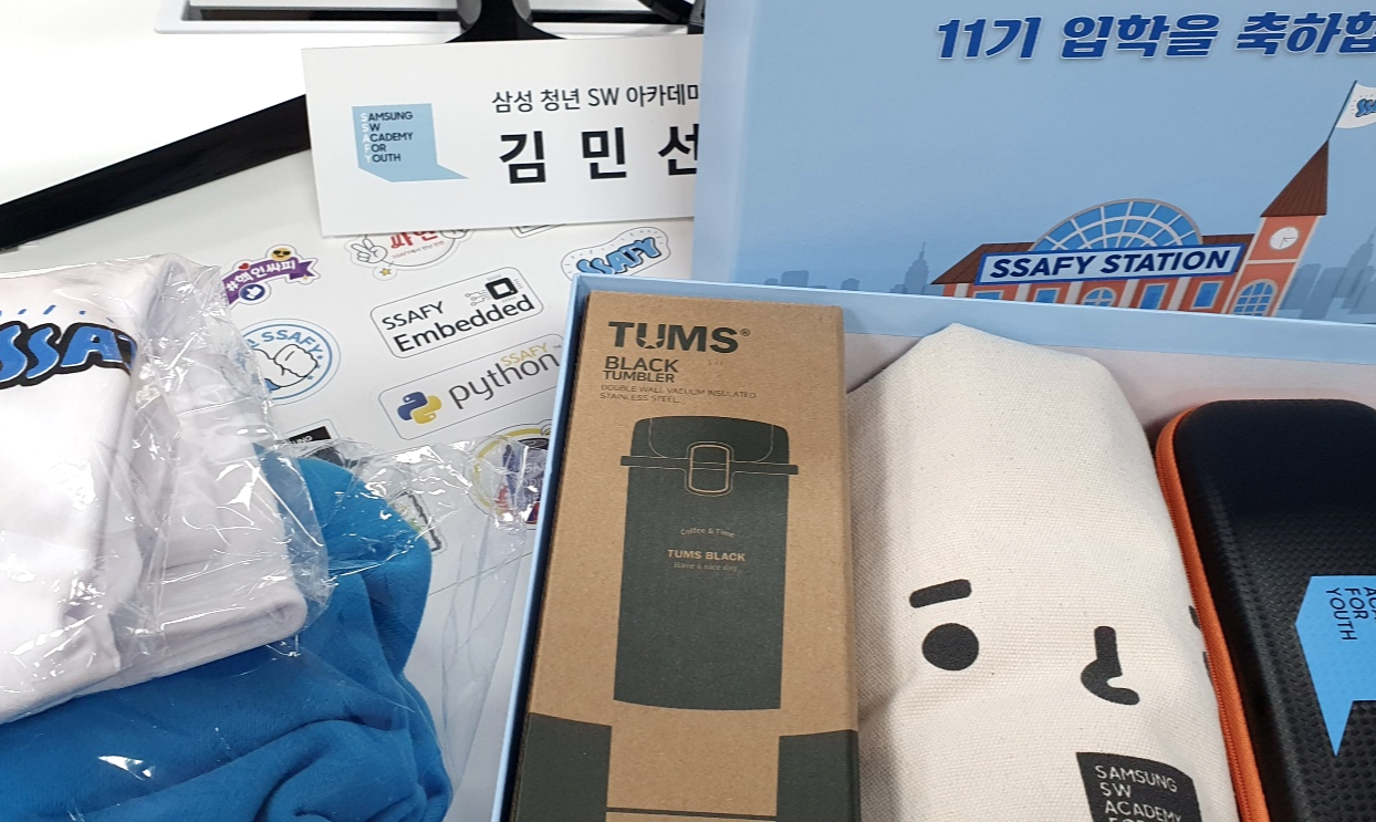 1/16 입학식을 시작으로 본 교육이 진행되었다. 입학식 때 웰컴키트를 받았다. SSAFY 로고가 있는 티셔츠와 집업을 주는데 공식 행사 때 입어야 하니 잘 보관하자. 텀블러, 삼각대, 에코백은 싸피에서나 일상생활에서나 유용하게 사용하고 있다!