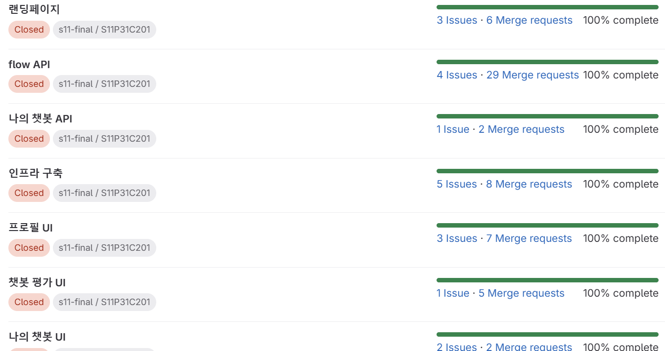 Jira로만 프로젝트 관리를 했었는데 이번 프로젝트에서는 Gitlab 이슈, 라벨, 마일스톤을 처음 사용해보았다. 개발 상황을 한 눈에 파악할 수 있는 것이 좋았다.