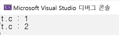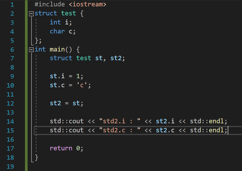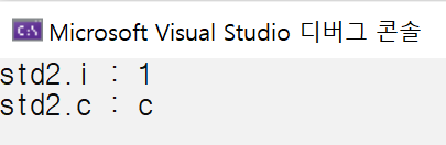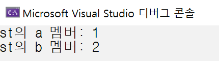 구조체도 보통의 변수들과 같이 =를 사용할 수 있다. st를 st2에 대입했다. st2의 멤버 i의 값은 st의 멤버 i의 값과 같아지고, st2의 멤버 c의 값은 st의 멤버 c의 값과 동일해졌다.