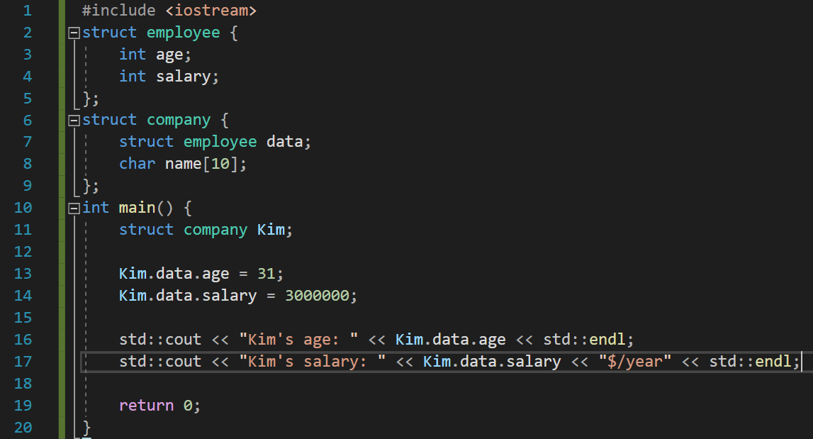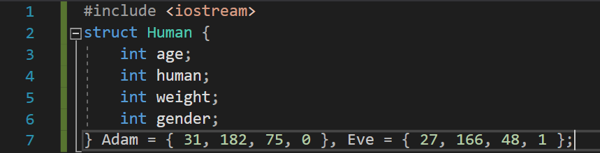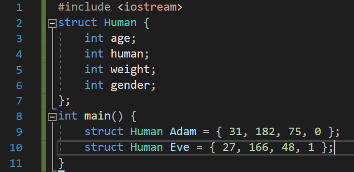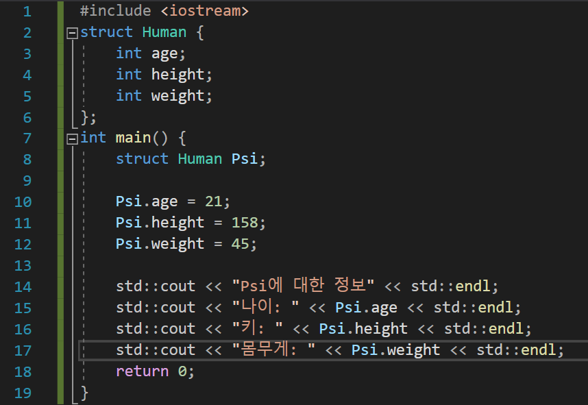 Human이라는 이름의 구조체는 3개의 멤버(int age, int height, int weight)를 가지고 있다. main 함수 내에서 Human이라는 구조체의 구조체 변수 Psi를 정의하였다. 여기서 놀라운 점은 struct Human이라는 것이 int형 변수를 정의할 때 int를 쓰는 것과 같이 사용되었다는 것이다. 이처럼 Psi를 정의하고 나면 Psi의 타입은 struct Human, 즉 Human 구조체가 된다.