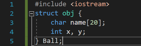 구조체 변수를 정의하는 방법 중 위와 같이 색다른 방법이 있다. struct obj 형의 Ball이란 구조체 변수를 정의하라는 뜻이다.