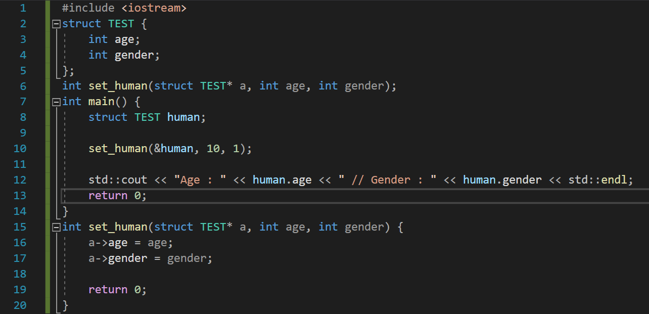 위 set_human 함수는 이전 예제와 다르게 구조체의 포인터를 인자로 취하고 있다. set_human 함수를 호출할 때에도 human의 주소값을 인자로 전달한다. 따라서 a는 human을 가리키게 된다.