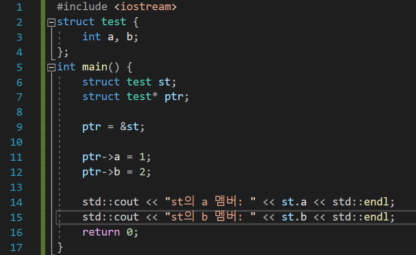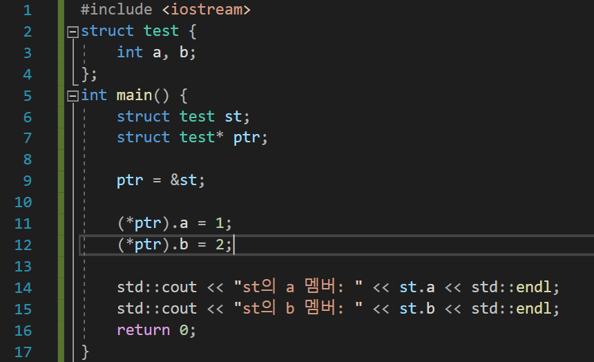 ptr이 st를 가리키고 있기 때문에 (*ptr)이라는 부분은 st와 동일하다. (*ptr).a = 1 은 st.a = 1 과 완전히 동일한 문장이다. 이 때 주의할 점은 괄호를 꼭 써주어야 한다. 구조체 멤버를 지칭할 때 사용하는 .은 *보다 우선순위가 높기 때문에 *ptr.a를 사용하게 되면 *(ptr.a)와 동일한 문장이 된다. ptr은 단순히 포인터이고 구조체가 아닌데 있지도 않는 a라는 멤버에 접근하라니 컴파일 시에 오류가 발생하는 것이다.