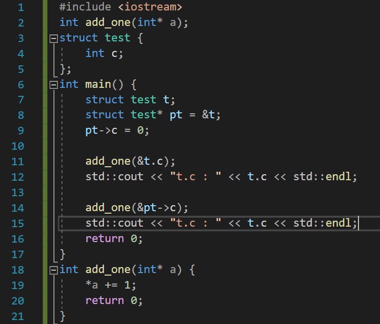 add_one 함수에 t의 멤버 c의 주소값을 전달하였다. 역시 &보다 .이 우선순위가 높으므로 &t.c는 &(t.c)와 동일하다. add_one 함수에 의해 c의 값이 1 증가한다. 마찬가지로 &pt->c에서 &보다 ->가 우선순위가 높다. 따라서, pt가 가리키는 구조체의 멤버 c의 값이 1 증가하게 된다.