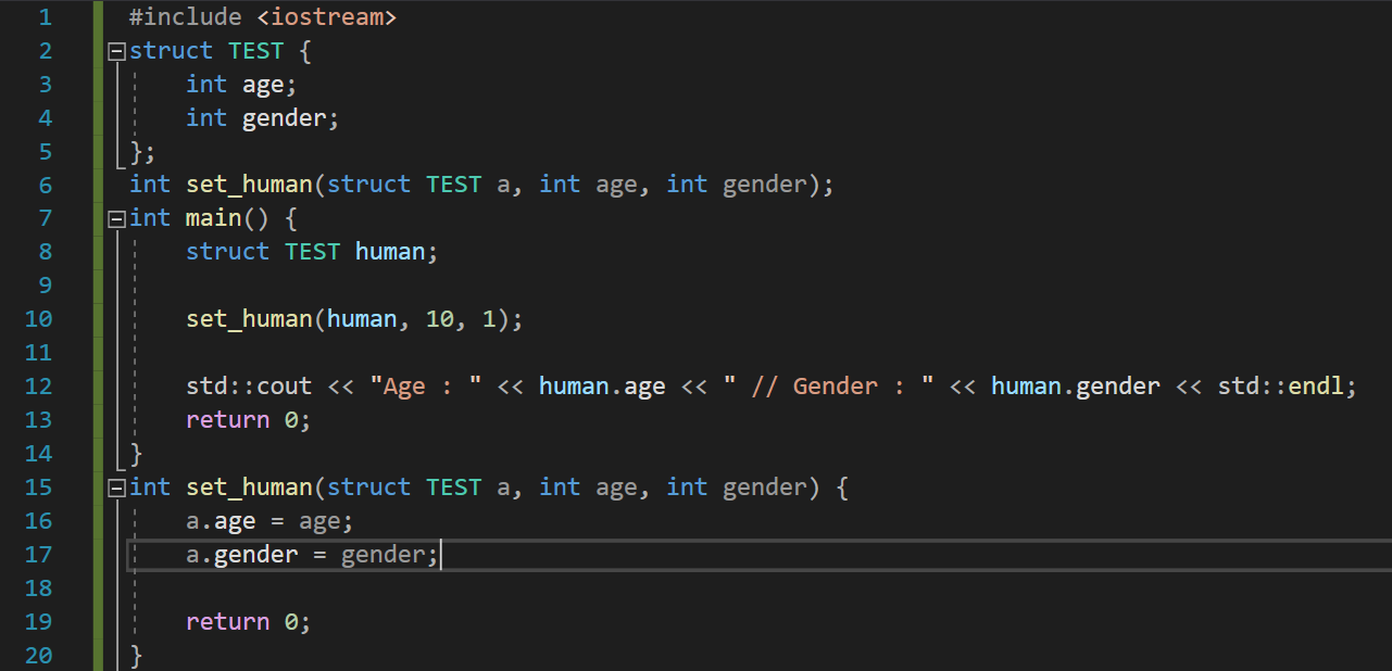 human 구조체 변수가 값이 초기화되지 않았다는 오류가 발생한다. 특정 변수의 값을 다른 함수를 통해 바꾸려면 변수의 주소값을 전달해야 한다는 룰을 지키지 않았기 때문이다. a.age = age; 를 했을 때 main함수에서의 human이 아니라 set_human함수의 a라는 human과 별개의 구조체 변수의 age 멤버의 값이 바뀌게 된다.
