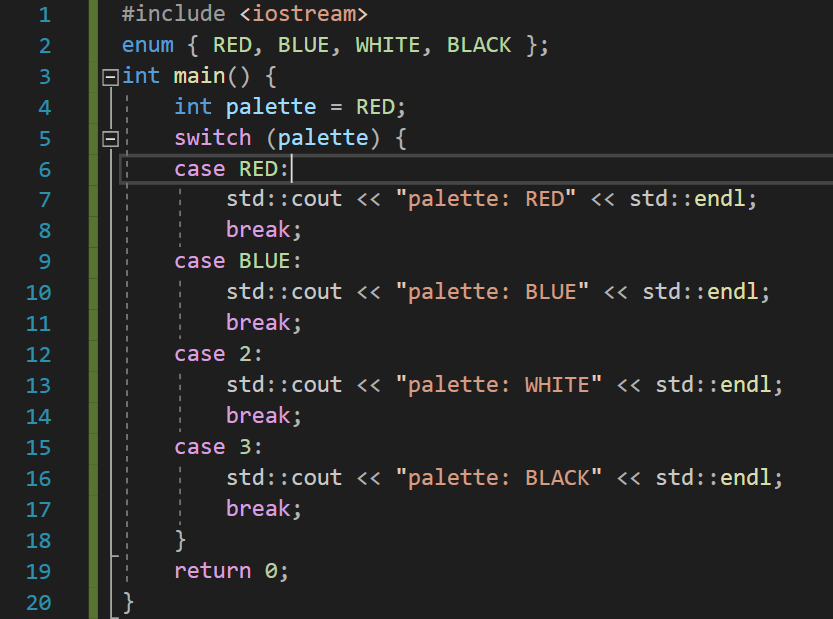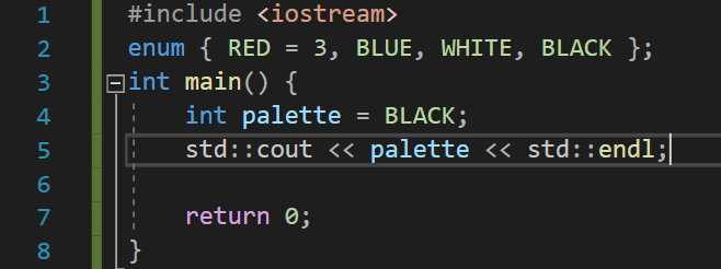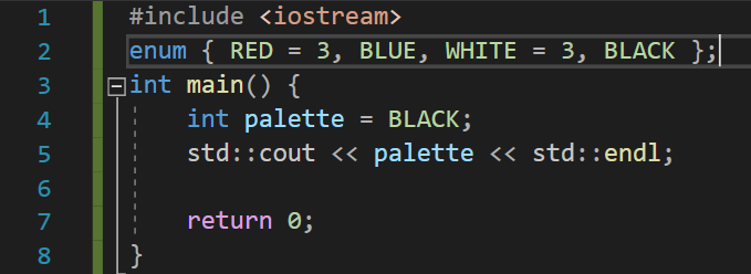 위처럼 한다면 수를 지정한 부분에서 다시 시작되는 방식으로 BLUE = 4, BLACK = 4 가 된다. 참고로 열거형에서는 언제나 정수값이어야 한다.
