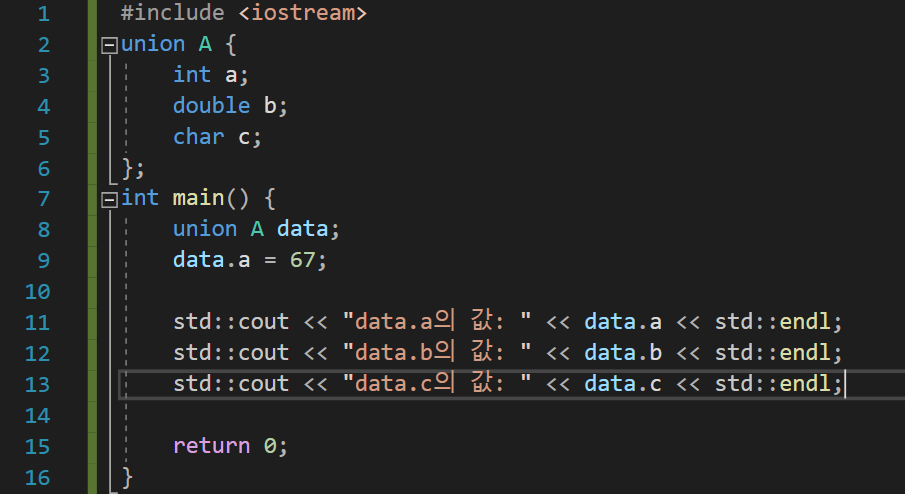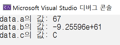 공용체 A의 멤버 변수 a에만 67이란 값을 저장하고 a, b, c를 출력하면 모두 각자 선언된 데이터 타입으로 변형되어 출력된다.