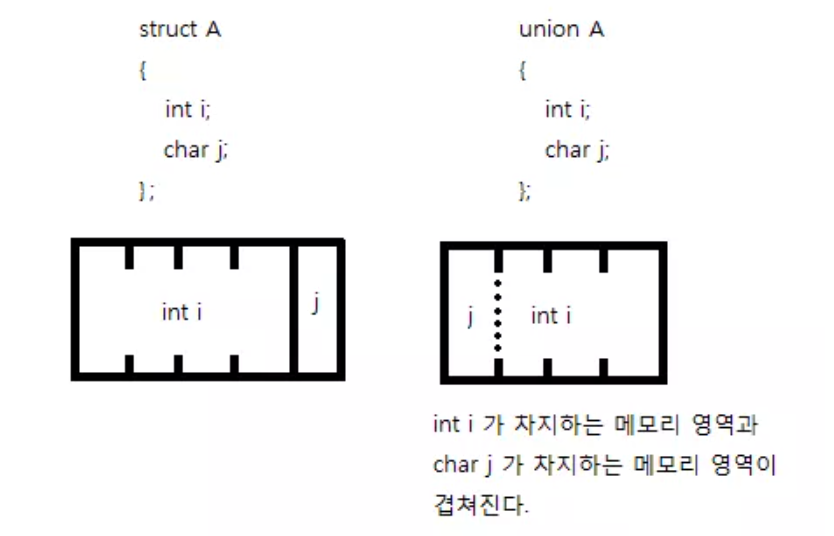 공용체는 구조체와 달리 메모리를 공유한다. 공용체들의 각 멤버들의 시작 주소는 모두 동일하다. 가장 큰 멤버 변수의 크기로 메모리를 할당받아 같은 공간에 자리잡기 때문에 한 번에 하나의 멤버 변수만 사용할 수 있다. 따라서 메모리의 크기가 제한되어 있거나 메모리를 절약하고 싶을 때 유용하지만 하나의 데이터 사용 후 데이터를 변경할 경우 원래의 데이터를 잃어버린다는 단점이 존재한다.