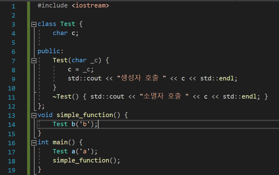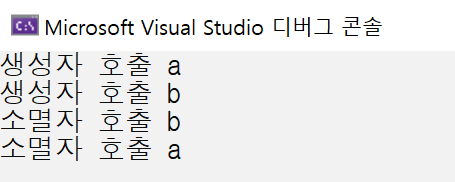 가장 먼저 main 함수에서 a 객체를 생성하였으므로 a의 생성하였으므로 a의 생성자가 호출된다. 그리고 simple_function을 실행하게 되면, simple_function 안에서 또 b 객체를 생성하므로 b의 생성자가 호출된다. 하지만 b는 simple_function의 지역 객체이기 때문에 simple_function이 종료됨과 동시에 b 역시 소멸하게 된다. main 함수가 종료될 때 마찬가지로 main 함수의 지역 객체였던 a가 소멸되면서 a의 소멸자가 호출된다.