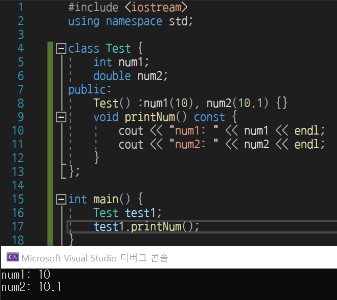 int num1 = 10;로 초기화가 진행되어 좀 더 뛰어난 성능을 발휘할 수 있다. 또한 이와 같은 이유로 const 멤버의 경우 생성과 동시에 초기화되어야 하기 때문에 const 멤버 변수는 이니셜라이저를 통해 초기화해야 한다.
