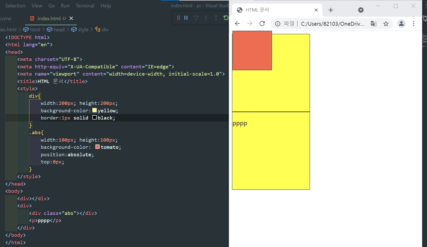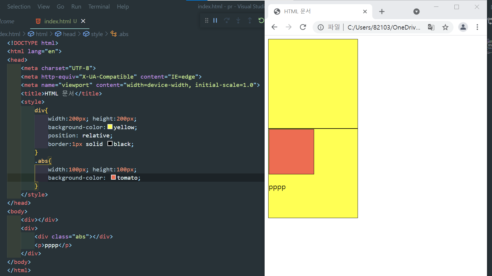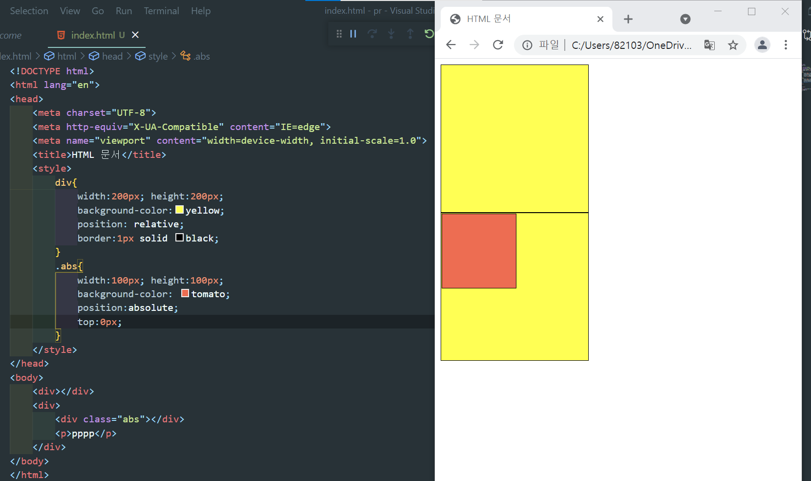 3) position : absolute - 절대 배치. positioned parent(position 값이 지정된 부모 태그)를 기준으로 배치