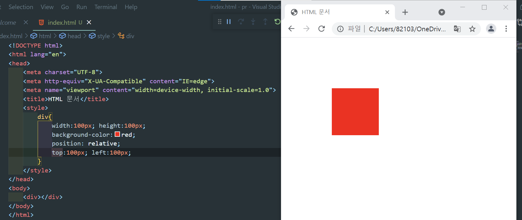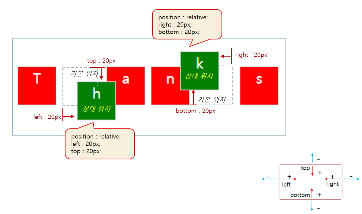 2) position : relative - 상대 배치. normal flow의 기본 위치에서 left, top, bottom, right 프로퍼티의 값만큼 이동