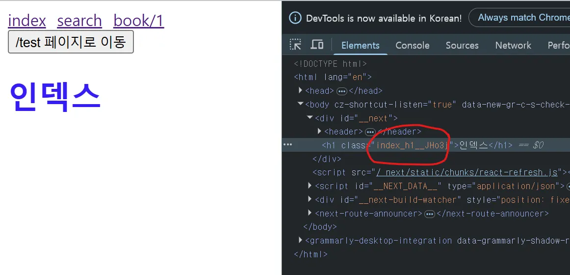 이 상태에서 index 페이지에 접속했다가 test 페이지로 이동할 경우, index.css 파일과 test.css 파일이 함께 로딩되어 클래스 이름이 충돌하게 된다. 브라우저는 .h1이라는 동일한 클래스명을 두 개의 스타일에서 읽게 되므로, 어떤 스타일이 적용될지 예측하기 어려운 상태가 된다.